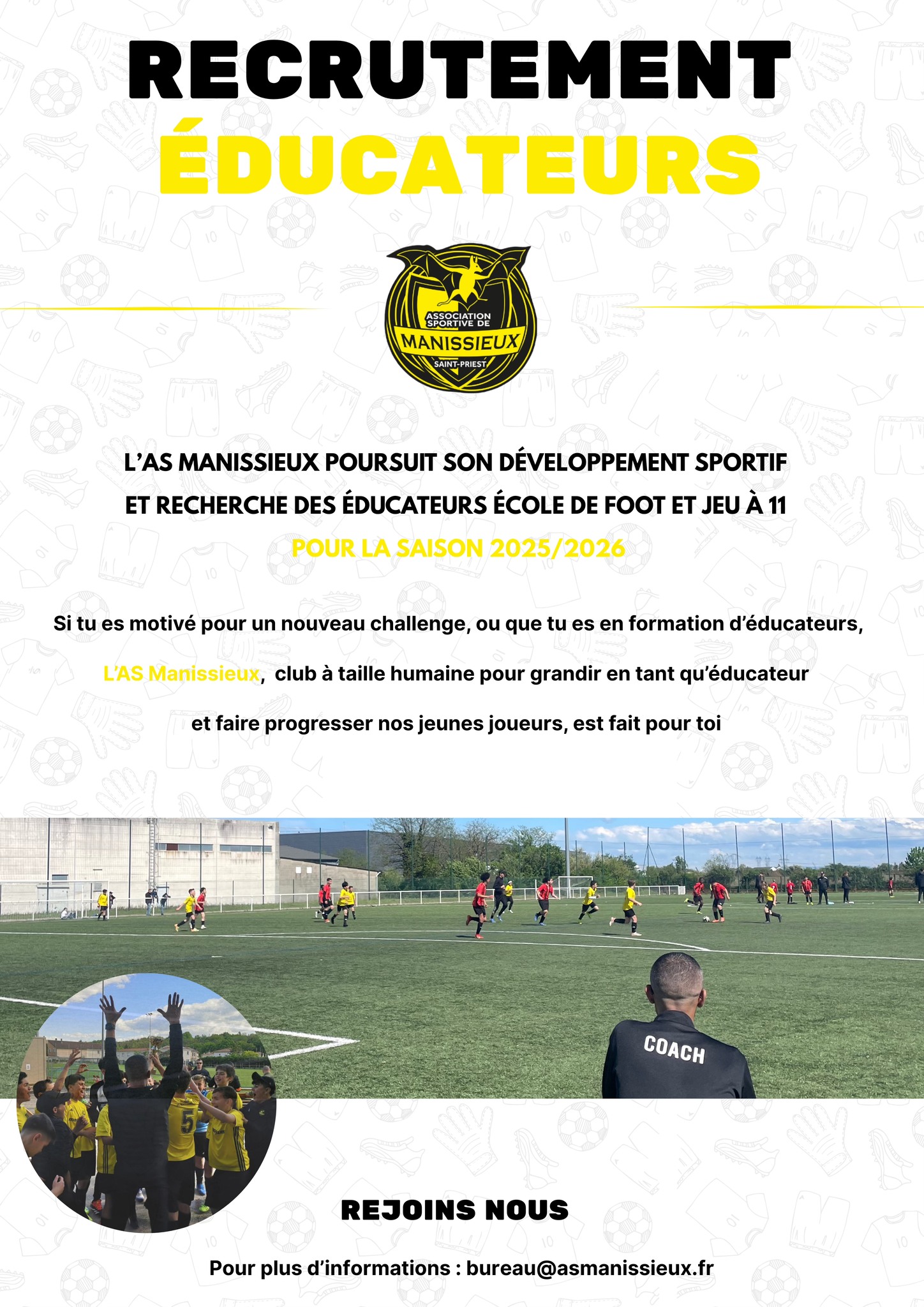 L’AS Manissieux, club à taille humaine, t’offre l’opportunité de grandir en tant qu’éducateur et de faire progresser nos jeunes joueurs dans un cadre structuré et bienveillant.