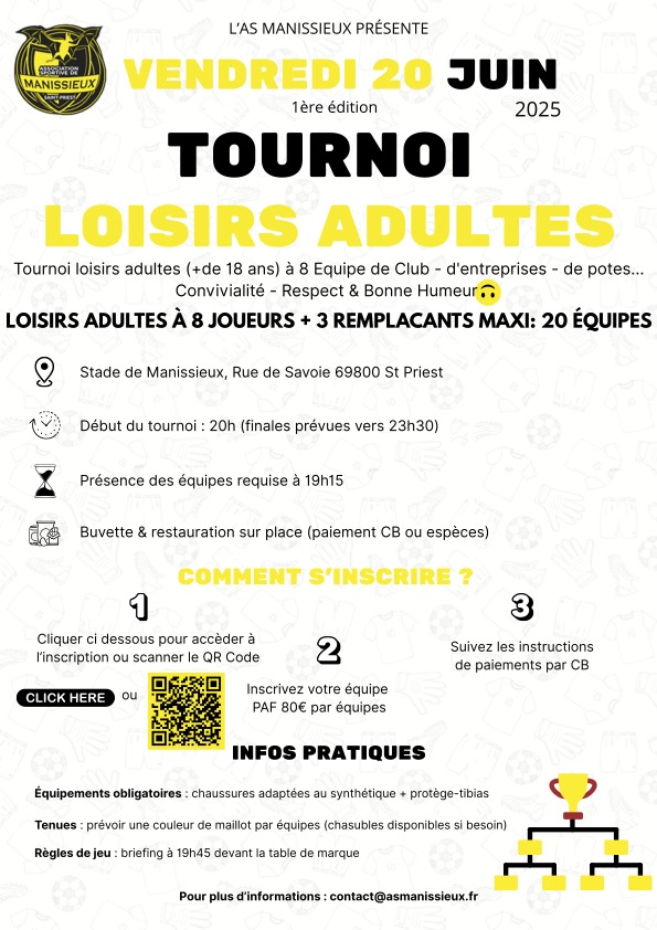 L’AS Manissieux organise son tout premier tournoi loisirs adultes (18+), en équipes de club, d’entreprises ou de potes, sur le format 8 vs 8 (+ 3 remplaçants maximum). Convivialité, respect et bonne humeur ! 20 équipes maximum.